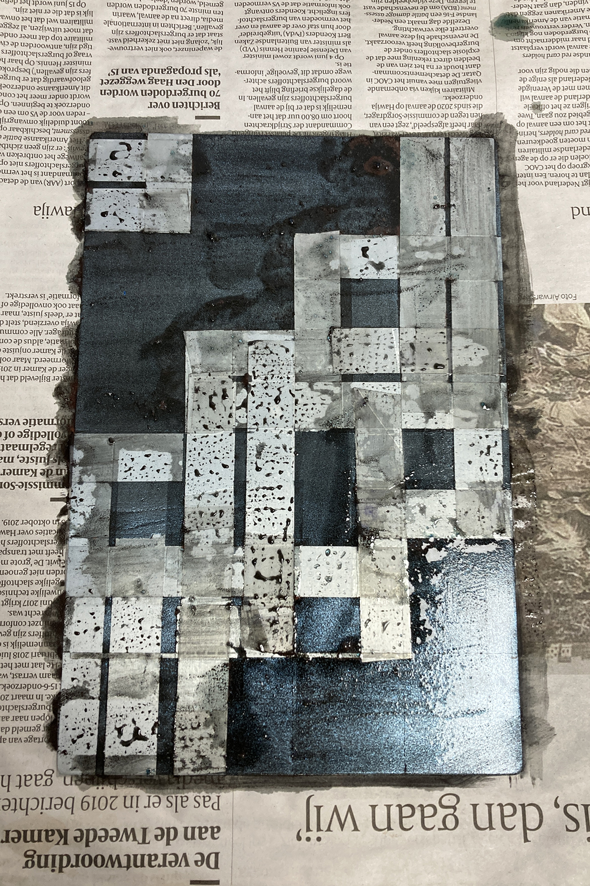 Spitbite; A method that just directly draws with the acid solution, instead of putting the whole plate into the acid bath. I covered some parts of the plate with plastic tape to test if it would remain unetched.